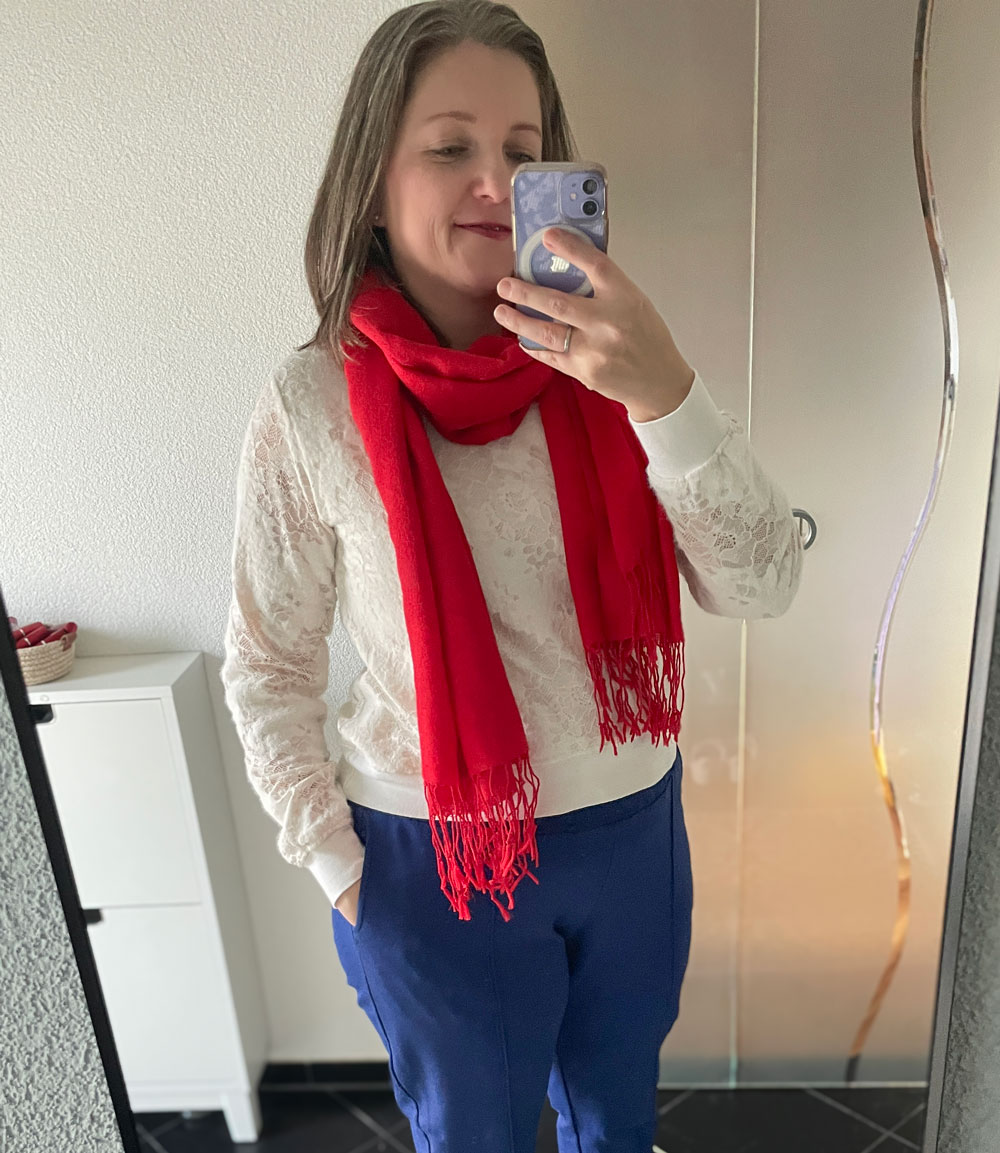 Ich stöbere unheimlich gern durch Modezeitschriften, durchforste Fashion-Online-Shops und inspiziere die Schaufenster – immer auf der Suche nach Inspiration und neuen Ideen für Modellanpassungen oder trendige Kombinationen. Meine Garderobe richtet sich dagegen überhaupt nicht nach Trends, denn ich nähe das was mir gerade gefällt. Aber ich lasse mich total gern inspirieren und sammle Ideen für eigene DIY-Kreationen und natürlich auch für meine Kurse. 😜 Auch Farben spielen eine sehr große Rolle in meinem Leben und in meiner Garderobe: Es gibt bei mir alle Farben außer schwarz, denn ich mag es gerne bunt, bunt, bunt! 🎨 Obwohl ich mit zunehmendem Alter auch immer wieder den Wunsch habe, mich eleganter zu kleiden, schaffe ich es nicht mich mit „Basic-Farben“ wie Schwarz, Grau und Beige so anzufreunden, dass ich daraus ein komplettes Outfit erstellen würde. Irgendeine Knallerfarbe oder ein cooles Muster muss dann doch immer mit dabei sein. 😂💥 Was bei mir in „elegant“ bereits gut geht ist Marine und Ecru… dazu noch ein pinker Schal und ich bin zufrieden. 🩷