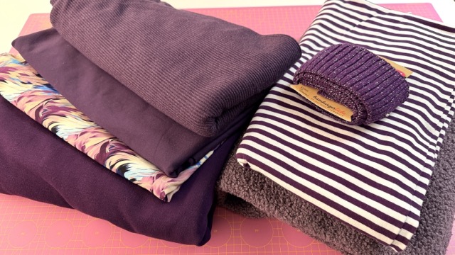 Ich selbst bin gerade total in Lila-Laune. 💜 Also habe ich mein Stofflager durchforstet und alles rausgezogen, was irgendwie lila war oder Lila-Anteile hatte – egal ob Romanit, Strick, Viskose-Webware, Sweat oder Baumwolljersey.